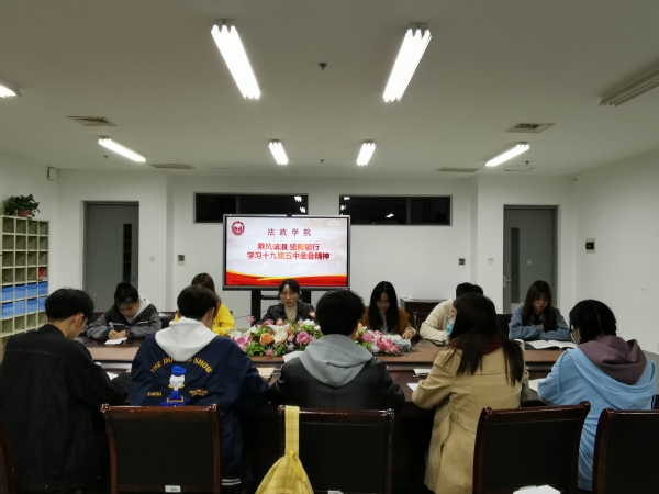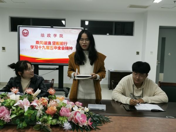 为深入学习党的十九届五中全会精神,法政学院于11月8日晚在综合楼A209开展专题学习活动。法政学院团总支书记陈翩、学生会主要学生干部参加。
