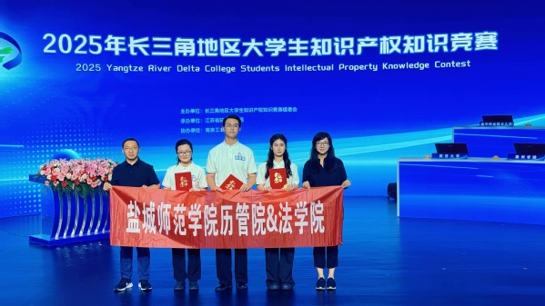 9月27日下午,2025年长三角地区大学生知识产权知识竞赛决赛在江苏电视台教育频道演播厅盛大举行并同步现场直播,观看人数多达53万。12支代表队齐聚南京、经过五轮激烈比拼,由历史与公共管理学院(法学院)李叶青老师、唐卫华老师担任领队,法学23级陈慧洁、蔺昕、谢添瑞三位同学组成的盐城师范学院代表队,在这场汇聚长三角高校精英的赛事中脱颖而出,一举斩获团体一等奖。近日,江苏省知识产权局专门就此次佳绩及我校长期以来在知识产权人才培养领域的突出表现,向我校发来表扬信,对我校予以高度肯定与诚挚祝贺。