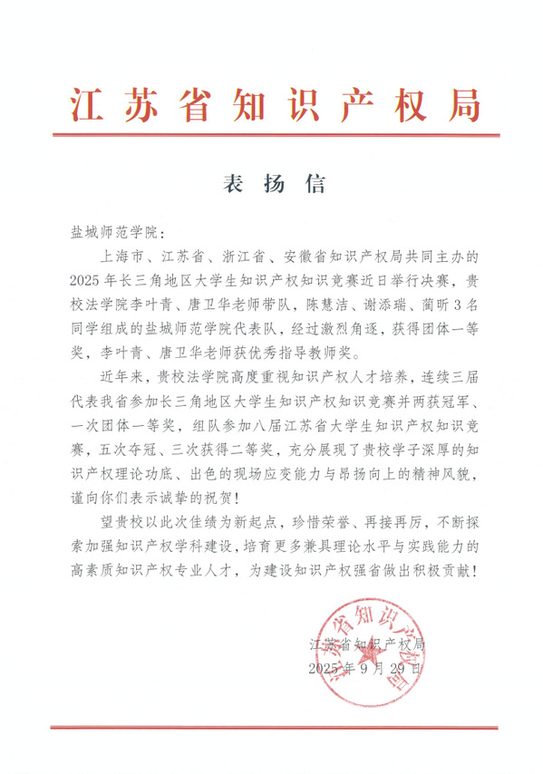 “创新沃土,励行致远;盐师引航,知创未来!”。 历史与公共管理学院(法学院)将以此次表彰为契机,进一步重视知识产权教育、积极组织参赛;学校也将呼应江苏省知识产权局在表扬信中的期望,珍惜荣誉、再接再厉,持续深化知识产权教育改革与学科建设,依托优秀教师团队,为区域知识产权事业培养更多兼具理论水平与实践能力的复合型高素质人才,为建设知识产权强省、推动长三角知识产权领域协同发展贡献盐师力量。
