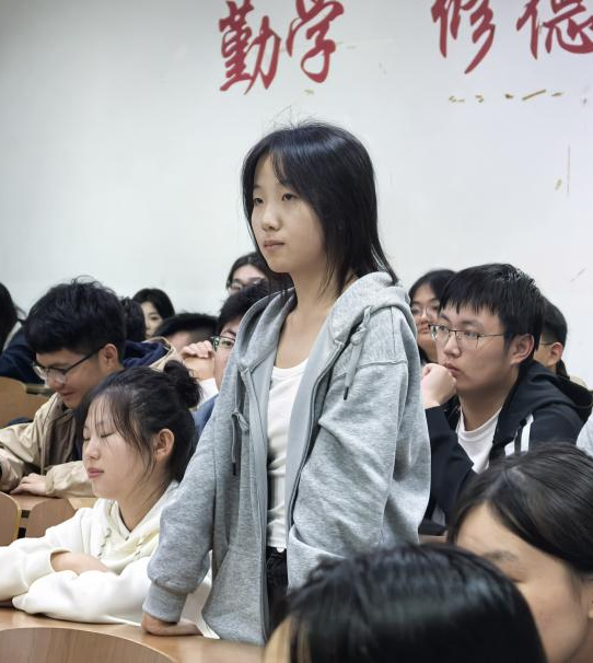 互动环节中,王妍苏针对新生提出的学业与就业困惑,结合自身经历耐心解答,以温和幽默的表达为新生缓解焦虑、增添试错勇气。25级历史师范定向班学生陆思源向王妍苏献上鲜花,完成一场关于成长与传承的青春互动。
