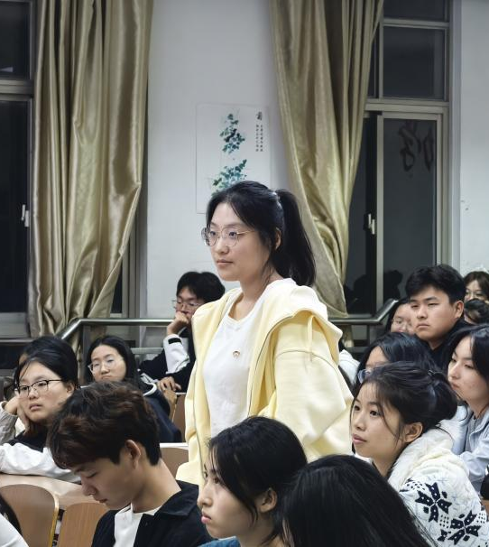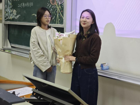 互动环节中,王妍苏针对新生提出的学业与就业困惑,结合自身经历耐心解答,以温和幽默的表达为新生缓解焦虑、增添试错勇气。25级历史师范定向班学生陆思源向王妍苏献上鲜花,完成一场关于成长与传承的青春互动。
