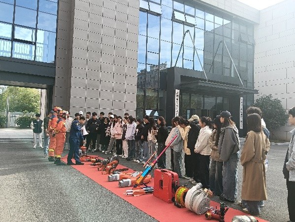 在消防救援大队刘威指导员的安排下,见习活动依次开展。首先是各类专业消防器具的展示和讲解。在此过程中,同学们着消防服装积极参与互动。