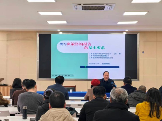 12月24日下午,省政府研究室原副主任、省城市经济学会会长、江苏沿海发展研究院首席专家、我校中文82届校友沈和受邀来我校作主题讲座。历史与公共管理学院(法学院)党委书记朱广东主持讲座,历史与公共管理学院(法学院)、江苏沿海发展研究院全体教职员工参加。