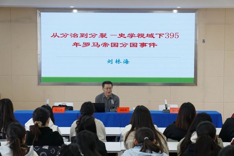 讲座中,刘林海教授以“395年罗马帝国分裂”这一传统观点为切入点,通过“分治”与“分裂”两个角度展开理性辨析。同时,刘林海教授提出几点思考,并给出深刻启示:从“主动分治”到“被动分裂”的认知转变,是史家时代背景与现实需求的投射;“分裂说”与“分治说”各有视角,需辩证看待;西方相关叙事也影响着国人对异域历史的认知,跨文化学习要警惕认知偏差、保持批判审慎。刘教授还指出,对历史的辩证探寻、对认知的理性辨析,正是文科独有的核心思维能力,也让文科在数字化的今天,成为最不容易被替代的存在。
