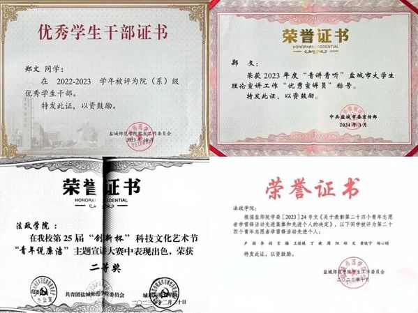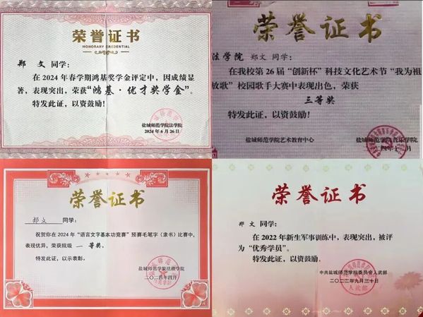 郑文,女,汉族,中共党员,历史与公共管理学院(法学院)法学专业22级法22(3)法学学生,曾担任法学院学生会轮值主席、现任法22(3)法学学习委员。曾获校专业一等奖学金、二等奖学金、三等奖学金、“鸿基.优才”奖学金、先锋奖学金,获校三好学生、校优秀学生干部、第二十四个青年志愿者学雷锋活动先进个人、“青讲青听”盐城市大学生理论宣讲工作“优秀宣讲员”、第十八届“挑战杯”全国大学生课外学术科技作品竞赛“红色专项江苏省二等奖 、第十八届中国创意挑战大赛国赛普通高等院校赛道短视频类三等奖、团干部思政技能大比武基层团支部书记专项赛三等奖、第二十五届创新杯“青年说廉洁”主题宣讲大赛校级二等奖等荣誉。