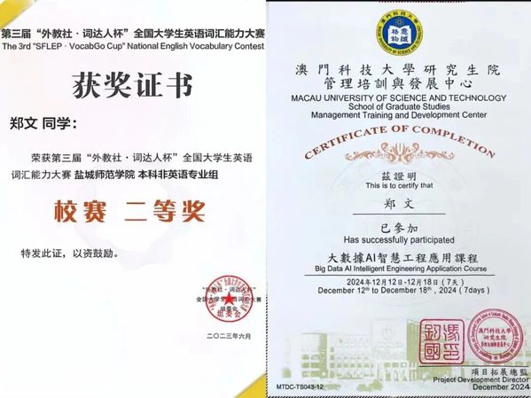 “博观而约取,厚积而薄发。”在法治信仰的引领下,郑文同学将专业学习视为立身之本。她深耕法学经典,探析法理精髓,以系统化的知识构建与创新性的学术思维,在多学期奖学金评选中屡创佳绩,多次获得专业奖学金,实现了学业成绩的跨越式突破。课堂上,她常以“为什么”叩问法理真谛;图书馆里孜孜以求构筑知识体系。在英语词汇大赛等跨学科竞赛中的卓越表现,更展现了其博采众长的学术视野。正是这份“板凳甘坐十年冷”的定力与“吾将上下而求索”的执着,让她在法学的星空中找到了属于自己的璀璨坐标。
